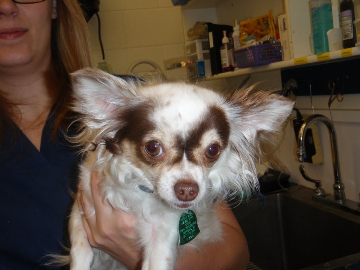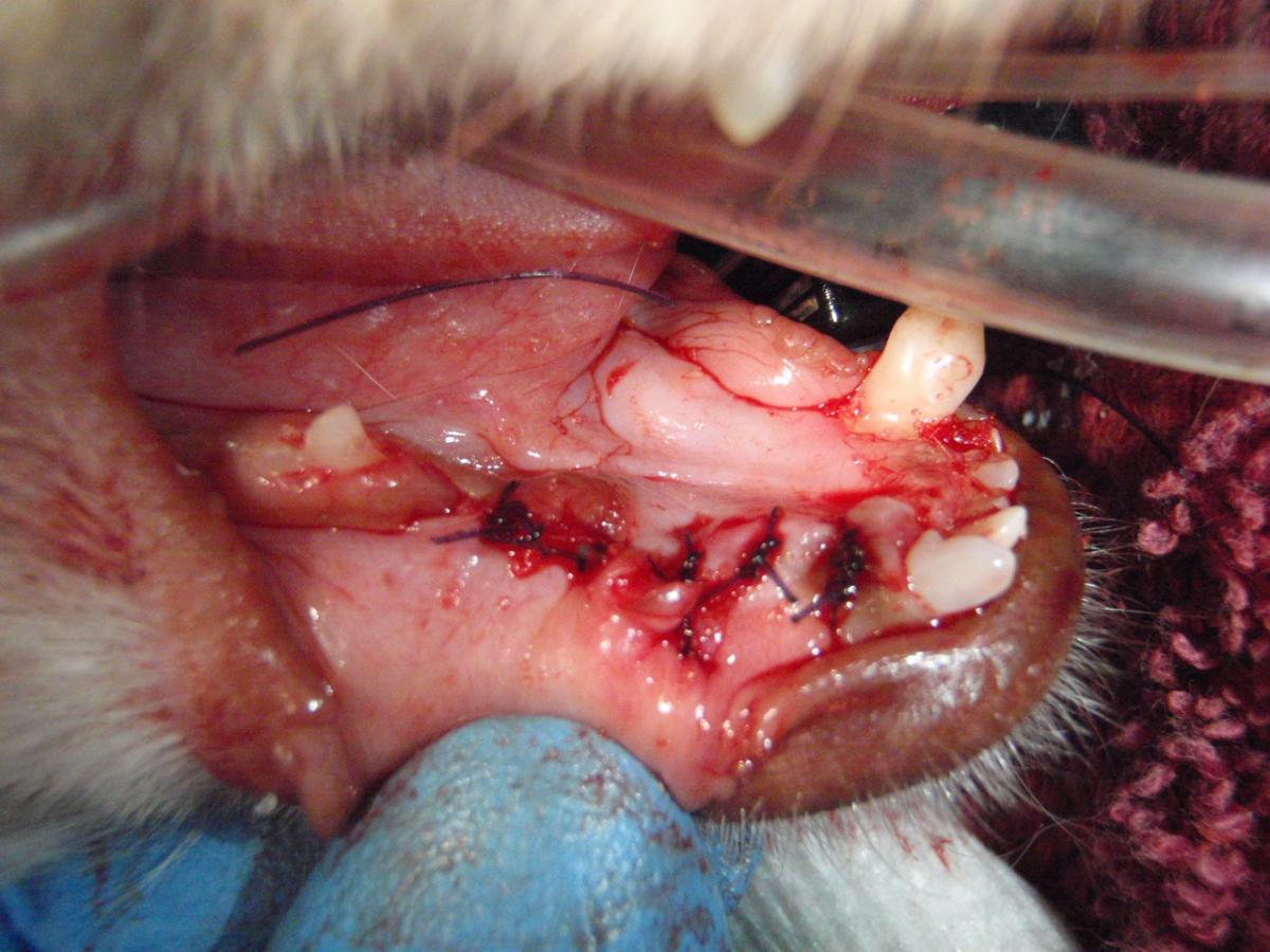 This is a 4 year old female spayed long haired chihuahua with a large purple lump located where the right mandibular canine should have been. At first presentation this looked like a mass on the jaw and that is what the owners thought. But after radiographing the jaw it was discovered that there was in fact an embedded canine that had never erupted properly. This dog also had a base narrow left mandibular canine tooth that was contacting the left maxillary third incisor. Treatment for this dog consisted of 1. Removing the embedded canine and the cyst that formed around it, 2. extracting the left maxillary third incisor to give room for the lower canine to occlude and 3. placing a composite extension on the left mandibular canine tooth so that it could tract properly outward instead of into the dog’s palate.