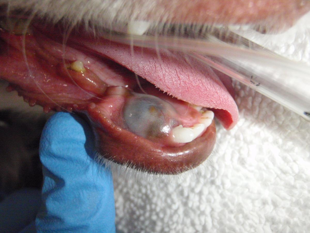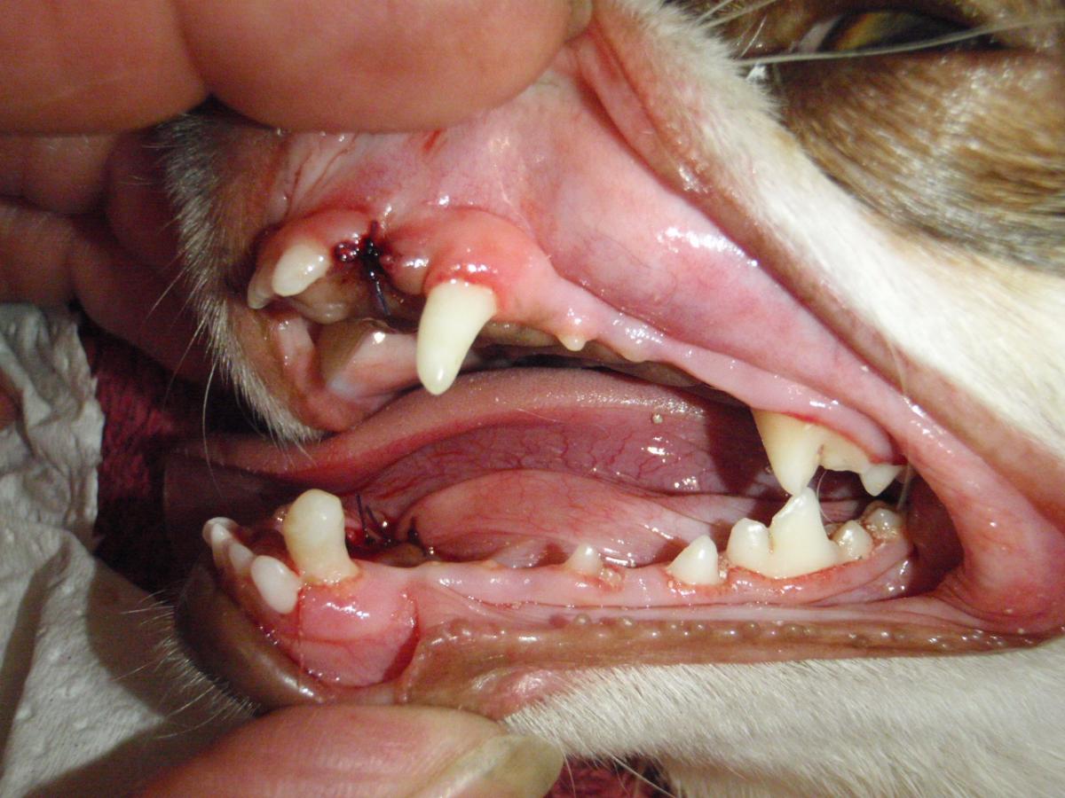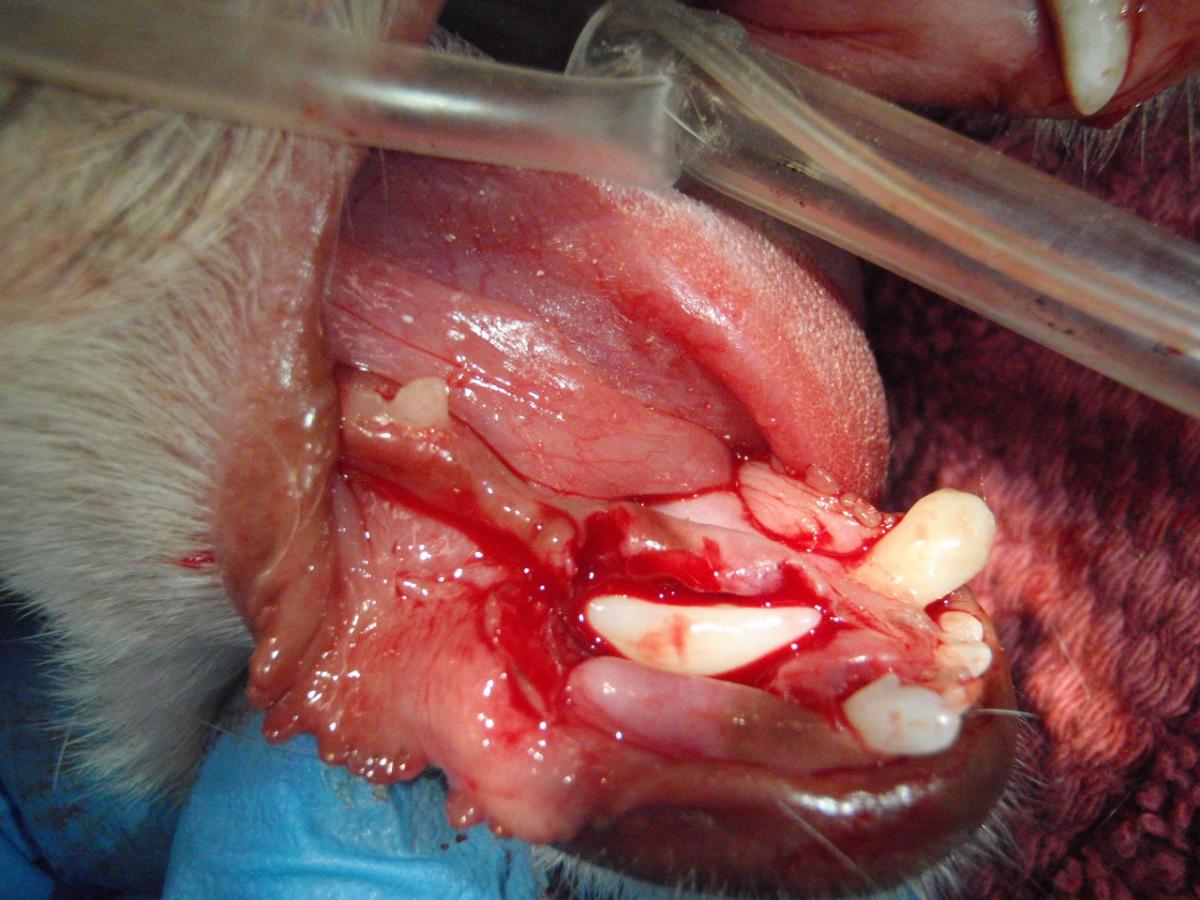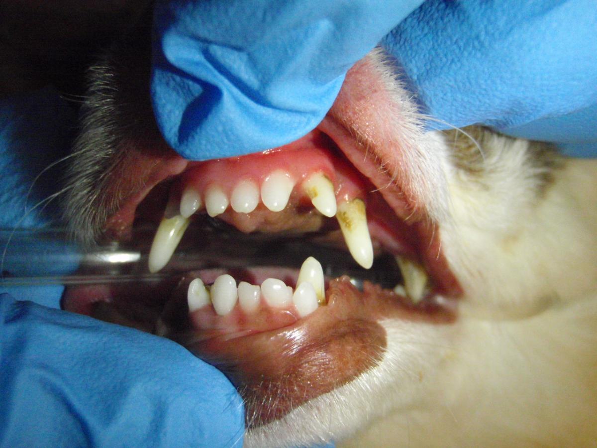 Base narrow canine teeth (linguoverted canine teeth) are a common malocclusion in dogs especially if they have persistent deciduous (baby) canine teeth. It is very important to treat these malocclusions as they sometimes lead to further damage to the palate and in some cases an oronasal fistula. Whenever there is a missing tooth, a radiograph should be taken to rule out the possibility of an impacted or embedded tooth. These often lead to a dentigerous cyst formation, which can be damaging to the surrounding bone as well as be painful for the pet.